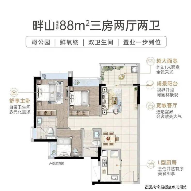 建面约92㎡三房两卫,舒居优选·阳光生活空间