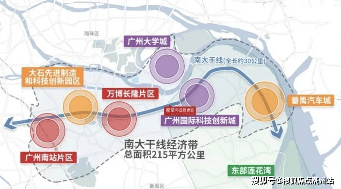 以中新知识城和南沙科学城为极点,落位国际创新城,汇聚国际一流人才资源、科技基础设施、高等院校、科研机构和科技型企业,如思科、韩国LS、探迹、小鹏汇天、广汽埃安等头部独角兽企业已相继进驻,带动第三中轴科技创新产业发展,未来产值将超万亿GDP。 南大干线经济带——项目依傍南大干线,是联系珠三角东西岸的重要发展走廊。