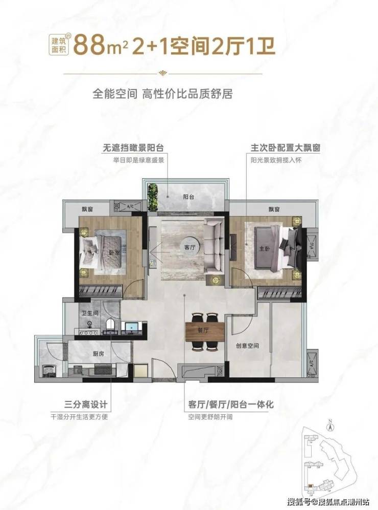如果是首套置业,可以看看 建面约88㎡2+1房 。三开间南向采光通风,采光面直接拉满;南北双阳台,功能分区更合理,生活阳台可洗衣、储物;观景阳台,可畅享阳光,拥抱美景。主卧带步入式衣帽间,还有超大L型飘窗,更是进一步放大了视野。