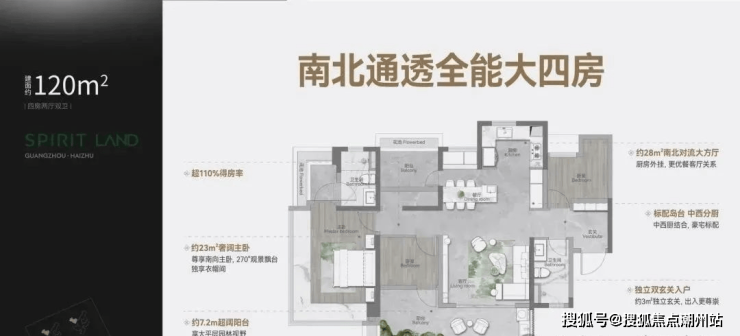 建面约120㎡ 四房两厅两卫;海珠唯一 1000万内南北通透大四房,双玄关入户 ;LDKG+X 约28m²南北对流大方厅 ,豪宅同款中西分厨;约7m大平层级阳台,约23m²奢阔主卧 私享独立衣帽间。