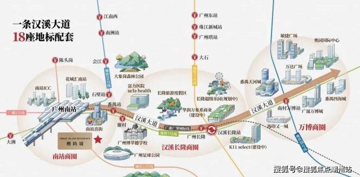商业配套:沿着汉溪大道,18座地标级配套群星闪耀,进一步改写片区生活剧本。容纳约7.5万人,全国最大的足球场今年兑现后,不管是看演场会、看比赛,还是运动踢球、专业集训,都能在家门口解决。南站ICC、花城汇、喜街、K11select、万象系,密如蛛网的地标商业,带来世界级地标商圈配置,出门就是逛不完的高端商业。 从南站到足球场,再到长隆万博,一站式的枢纽、文体文旅、商圈等资源紧密咬合,自由流动。