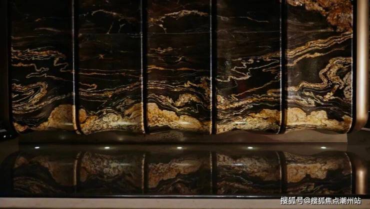 正中摆着个叫《潮涌》的雕塑,采用了非遗洒金工艺,远看跟满天星似的。