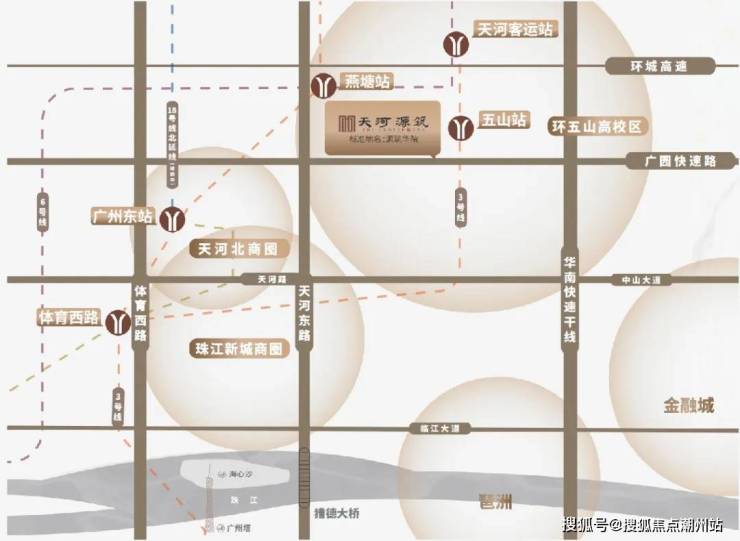 地铁交通:距地铁3号线和10号线(建设中)五山站约1.3公里,另外到3号线燕塘站、6号线天河客运站,大约在1.7公里。地铁口都不算很近,需通过公交接驳;项目门口设公交站点,未来规划优化接驳线路。