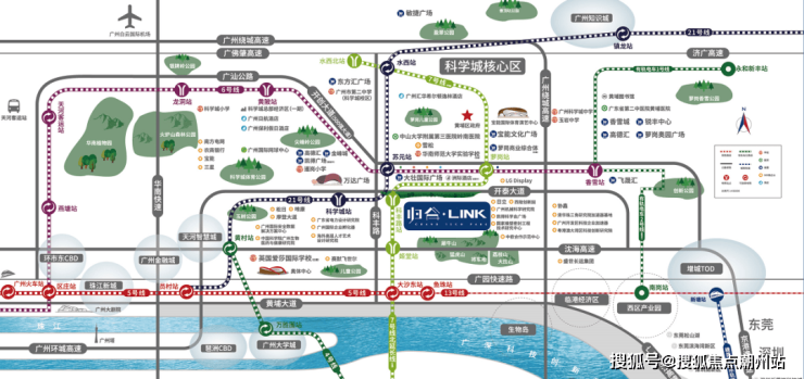 地铁——距离广州地铁6号线与地铁21号线交汇站苏元站约700米,地铁7号线科丰路站边上,三轨道交通交汇,真正的地铁上盖;自驾——紧挨黄埔科学城三横两纵(开泰大道、开创大道、沈海高速、科丰路、环城高速)主干道,半小时广州主城区生活圈;公交——门口有开泰大道新阳路口站,途径324路、336路、339路、349路、359路、375路、573路 等多路公交路线。