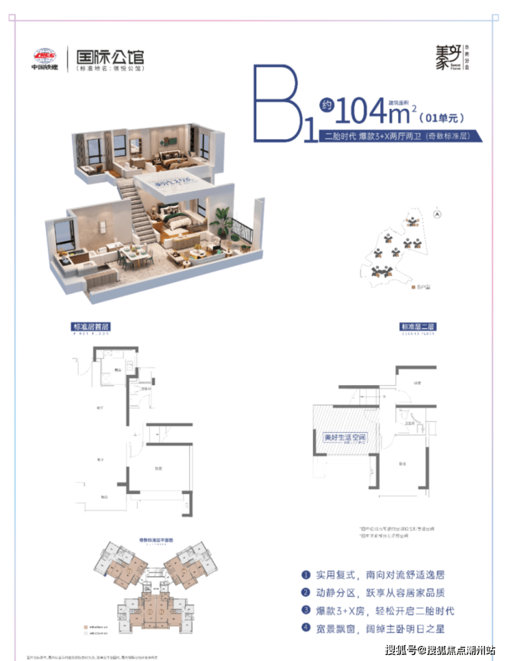 中国铁建国际公馆是广州东部在售咬合式复式,全新复式4.0设计,打造南向对流,打造平层无法享受甚至想象的居住体验。项目目前在售户型有104-118㎡3+1创新户型,使用率超100%,比别人多一房;至少三卧室朝南…