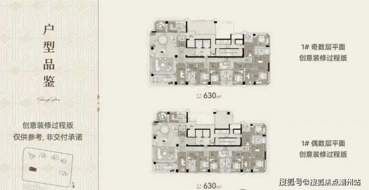 1号楼和9号楼的位置最好, 所以面积最大。其中1号楼是楼王,面积达到630㎡。9号楼的面积次之,在411-436㎡之间。另外,6号楼和8号楼的面积在270-347㎡之间。3号楼面积最小,203-227㎡之间,所以主力户型为237-347㎡。