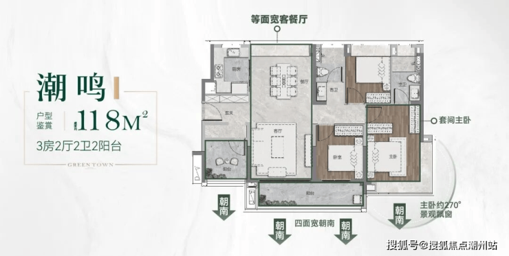 【118㎡B1户型 3房2厅2卫2阳台】四面宽朝南、南北通透对流双景观、主卧L型扩景飘窗,沉浸式景观尊享、强大收纳系统。