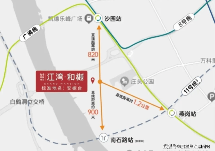 越秀珠实城发江湾.和樾项目距离地铁8号线沙园站约800米。距离广佛线燕岗地铁站约1.2公里。距离首条环城线11号线南石头站约900米。自驾有在建的环岛路串联海珠9纵9横路网。