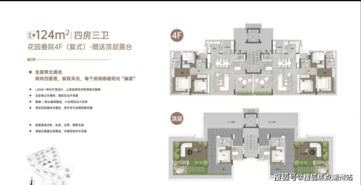 这是最接近墅级形态的户型,下层做了侧花园设计,顶层的天面露台全赠送,实现了约242%的使用率