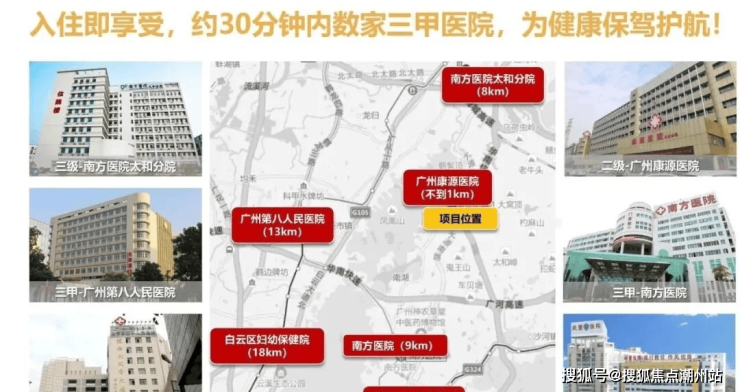 三甲医院友好医院就在家门口。距离项目不到1公里内有一所二级的广州康源医院,8km有三级南方医院太和分院。