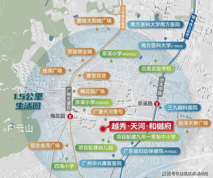 广州越秀天河和樾府项目位于天河北梅花园板块,距离珠江新城直线距离仅5公里,这里可一路串联广州大道北、天河北、珠江新城等商圈,小区距离地铁3号线梅花园站步行约800米,附近还有在建设的18号线北延段京溪路站,小区旁还配建了幼儿园以及九年制学校,由华阳小学+广州中学管理,预计明年9月份就能开学。