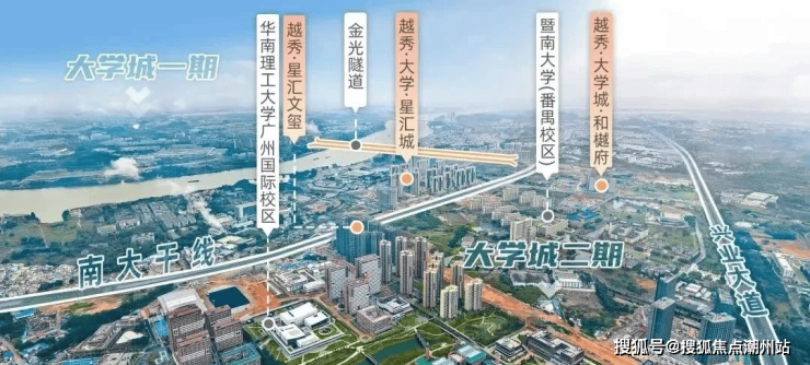 越秀大学星汇城项目位于国际创新城新造板块,南大干线边上,对面就是华南理工大学,项目距离大学城和琶洲都很近,小区距离地铁4号线也不远,所以无论是开车还是地铁去万博、大学城、琶洲都非常方便,小区还对口九年一贯制广大附中学校,已开学。
