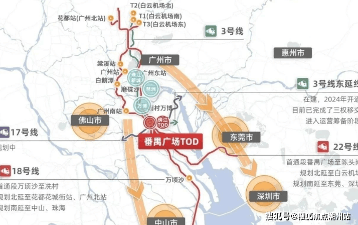 广州保利琅誉坐落于番禺广场TOD的核心区域,傍雁路附近,距离正在建设中的地铁3号线东延段滂江站直线距离不到600米,步行大约1公里,目前施工进度已达90%,预计明年通车。这意味着在您收楼之前即可享受到便捷的轨道交通服务。从滂江站出发,不仅可以直达珠江新城,还能一站抵达番禺广场换乘18号线和22号线,大大缩短了前往广州主城区的时间成本。