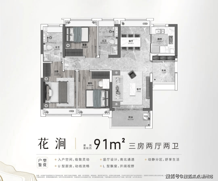 高性价比,91㎡爆款三房,舒适三房,对流设计,动静分明,实用率高。