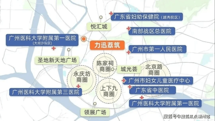 力迅·荔筑项目3公里范围内广州市第一人民医院、广州医科大学附属第一医院、广东省妇幼保健院越秀院区、南部战区总医院、广州医科大学附属第三医院、广州市妇女医疗中心、广东省中医院等。