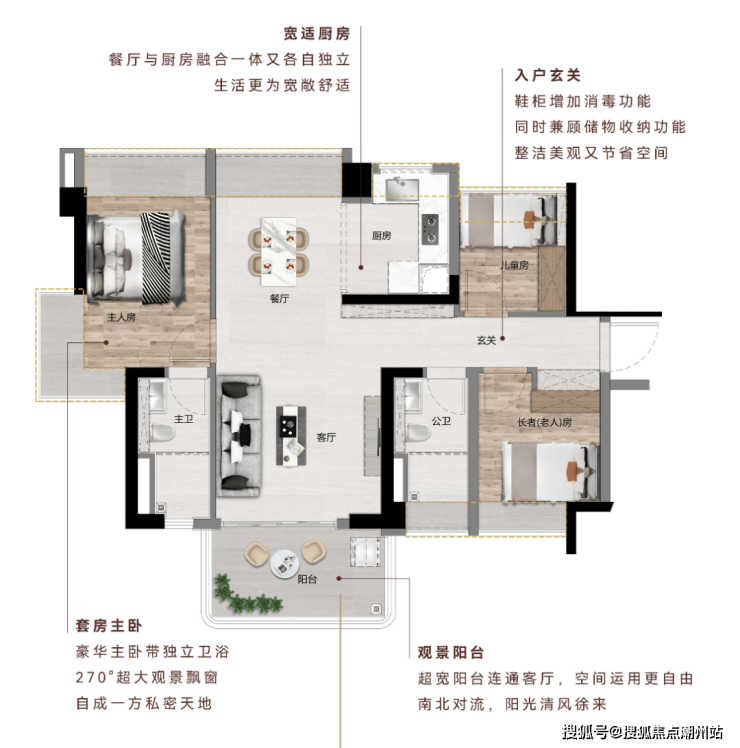 南北通透|主卧 270°飘窗+双飘窗|U 型厨房|南向观江景阳台