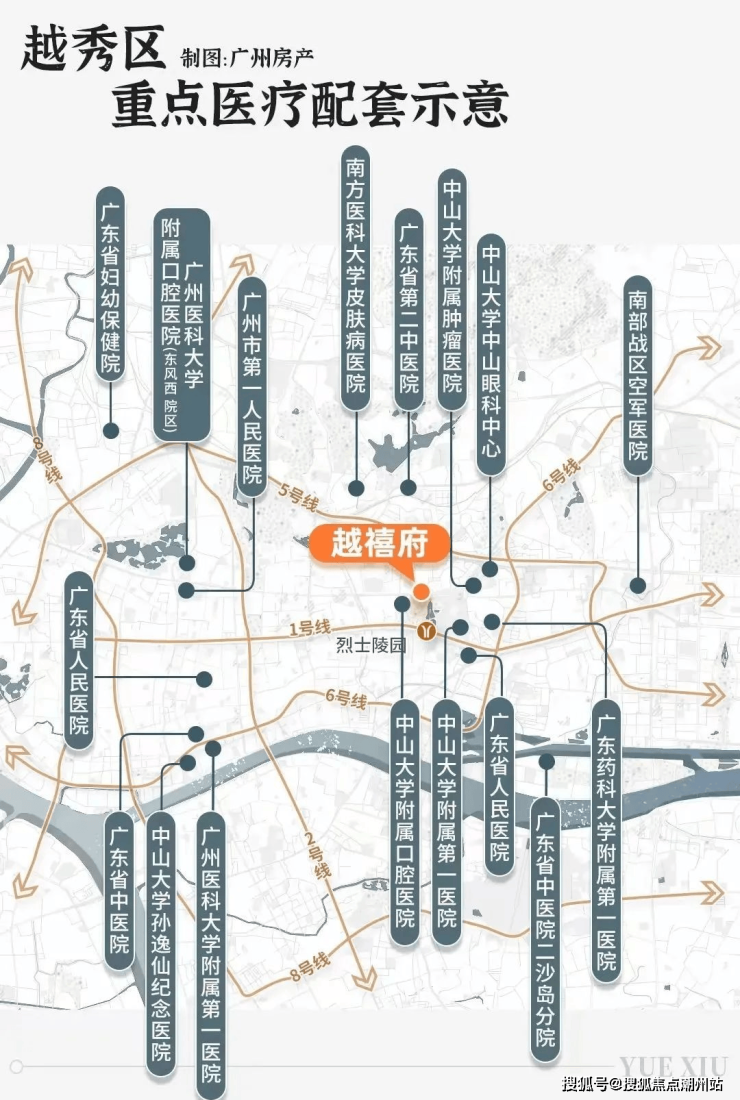 医疗配套:优质医疗资源环绕,健康生活无忧。越禧府项目坐落于广州越秀区核心医疗圈,周边汇聚14家知名三甲医院(车程约10分钟),占全市三甲医院总量的近40%。步行仅5分钟即可到达4所顶尖医疗机构: 医科大学附属第一医院(综合实力强劲) 、 中山大学附属第一医院(华南地区医疗标杆) 、 中山眼科医院(全国知名专科医院) 、 肿瘤医院(权威肿瘤诊疗中心) 。