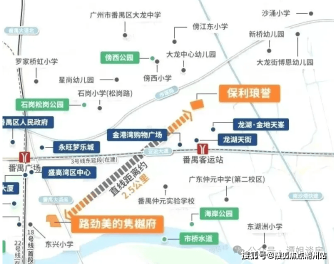 项目距离地铁3号线东延段傍江站直线约500米,步行要900米左右,一站即达番禺广场站。