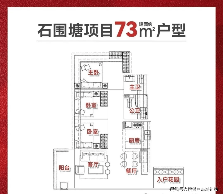 约73(77)㎡三房,两个户型相似,主卧可以实现270°观景,还有衣帽间和独立卫生间。不过,独卫面积较紧凑,难做干湿分离。