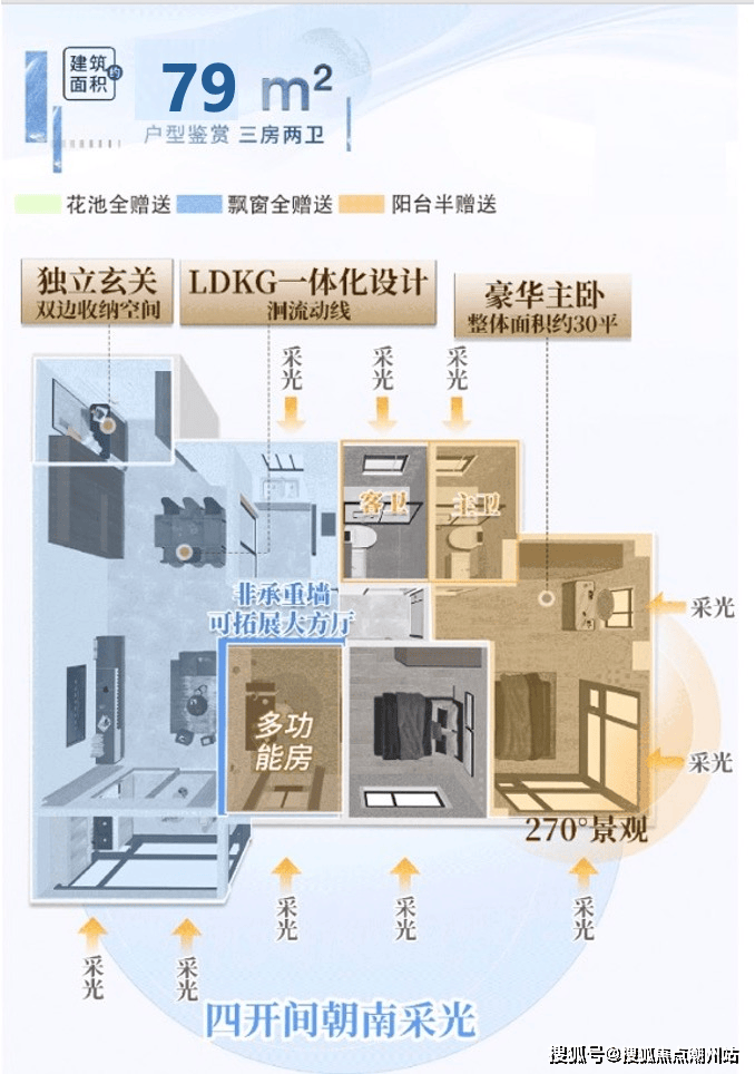 【79㎡-3房2厅2卫】独立玄关双边收纳空,可变LDKG一体约7米长进深,四开间南向,约25㎡豪华主卧,保证空间利用率,又能实现功能需求全覆盖