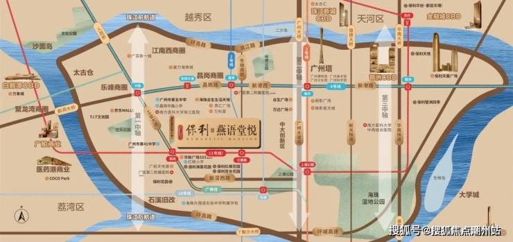 保利燕语堂悦项目坐落于工业大道中,背靠珠江后航道,傲立于海珠新活力文商旅融合圈与广州市“首个”后航道服务型制造创新带交汇的核心地带,海珠后航道将成为海珠未来唯一连片开发的豪宅板块。环拥整个海珠乃至广州最顶尖的产业、商业、文旅资源,最为宜居的纯粹居住区,媲美“法国左岸”,凝聚海珠特有的文化发展脉络与基因,既能共享中央活力区和广佛高新技术园区双向红利,又能尽收老城醇熟烟火。