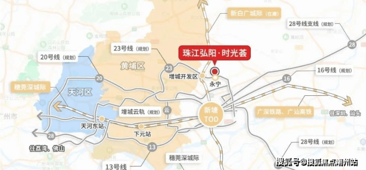 交通方面珠江弘阳·时光荟紧邻新白广城轨和地铁23号线-永宁站(规划中),紧靠增天高速,实现“高速+地铁+公交”全覆盖,1站新塘TOD,2站黄埔(夏园站),3站天河(吉山站)。