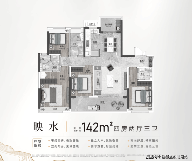 改善首选,142㎡奢阔四房,板式设计,南北对流双阳台,两梯两户,近4米客厅以及约6.7米阳台的宽度,融接山林风光,广州罕见的高舒适度产品。