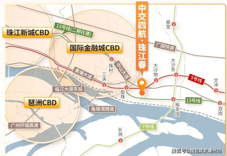 珠江春项目交通配套:项目距离地铁5号线鱼珠站和大沙地站双地铁站约800米,目前就能通过地铁5号线直达金融城、珠江新城,未来13号线二期开通后,也通过鱼珠站直抵珠江新城。