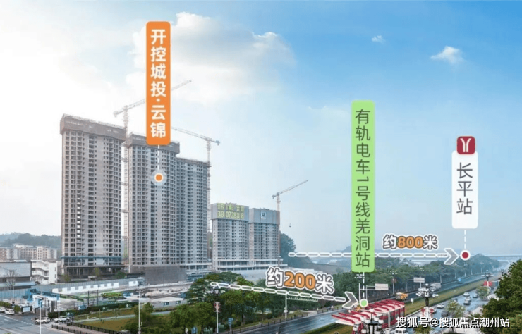 城投云锦位于广州市黄埔区永顺大道与萝岭路交汇处西南侧,地处长岭居门户位置。项目紧邻21号线长平站,步行距离约800米,也可通过有轨电车一站到达羌洞站,再步行几分钟即可抵达售楼部。从地铁距离来看,项目距21号线长平站仅约800米,可一站直达科学城,四站至天河,交通优势明显。