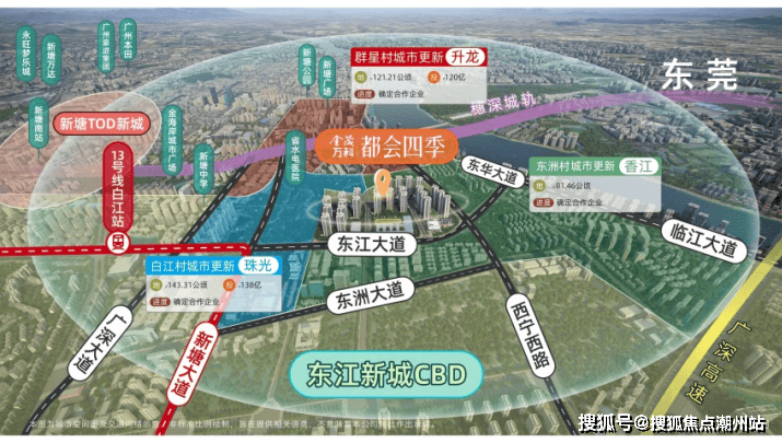 项目区位: 项目位于广州市增城区新塘镇东江大道和西宁西路的交汇处, 广州地铁13号线沙村站和白江站附近 ;坐落于广州东进桥头堡的东江新城,与新塘TOD新城共定义为“双CBD”,作为广州东部新中心的广州第三CBD,享受东进、北拓发展红利。