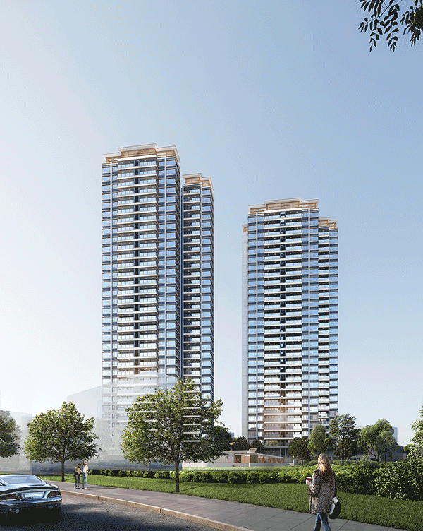 项目地块较小,由2栋30-33层的塔楼组成,楼栋通过扭转一定的角度,实现了户户朝南,实现约80%梯腿望江