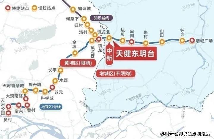 交通方面,项目紧邻21号线中新站,快线3站就能到天河员村,换乘5号线直达珠江新城,早高峰通勤比很多近郊盘快;1站到镇龙TOD,这里能换乘穗莞深城轨(新白广段),可速达白云机场。自驾也很灵活,周边有广河高速、花莞高速、增天高速(即将开通),还有广汕路、新新大道等快速路,能到天河核心区域、科学城,对在天河、科学城上班的刚需比较友好。