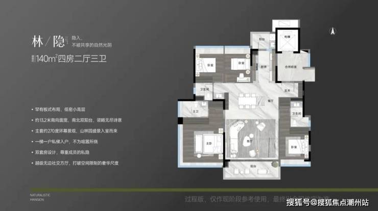 建面约164㎡4房3卫,四开间朝南,16.9米南向采光,270°景观大主卧。