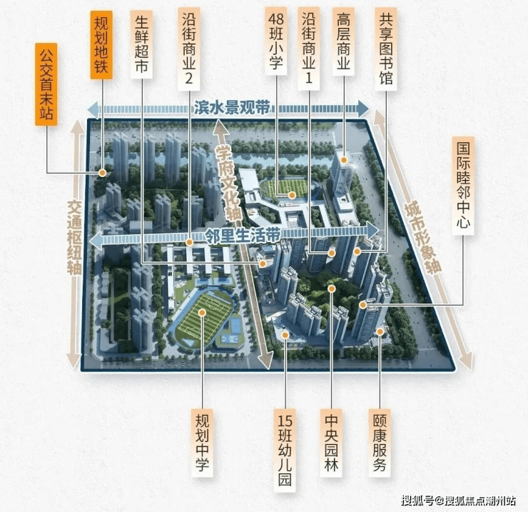 项目教育配套:项目自建15班幼儿园、48班小学、36班中学,以及广州市明贤科学高级中学(预计2025年9月开学),实现从幼儿园到中学的一站式公立教育,且计划引入广州大学附属学校等名校资源。