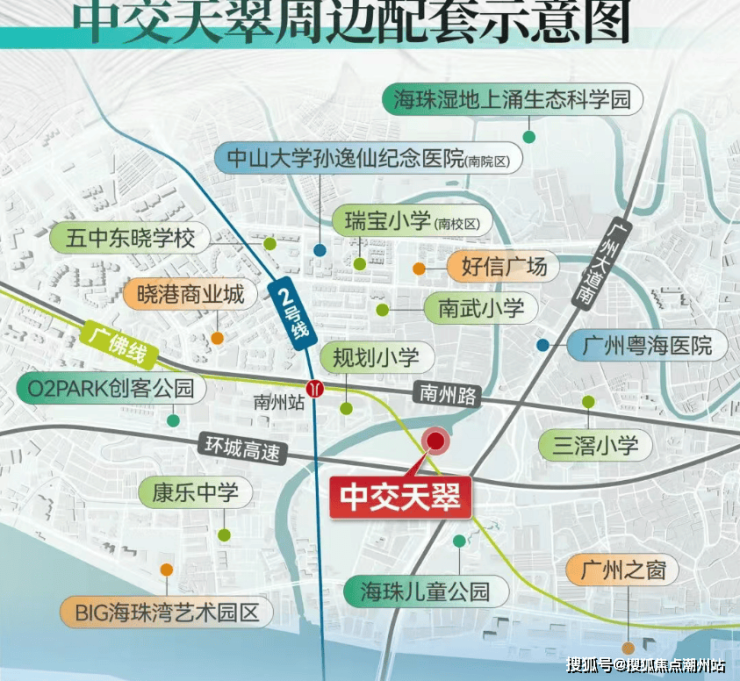 中交天翠位于海珠西部南洲板块,就在广州大道南和环城高速交汇处,所以项目自驾出行还是挺方便的,不过由于小区紧邻两条主干道,所以噪音和粉尘影响也基本少不了,项目距离地铁也不远。学铁商全能配套,北瞰广州塔,南望珠江水,居于公园中,兼具江景城景、园景。