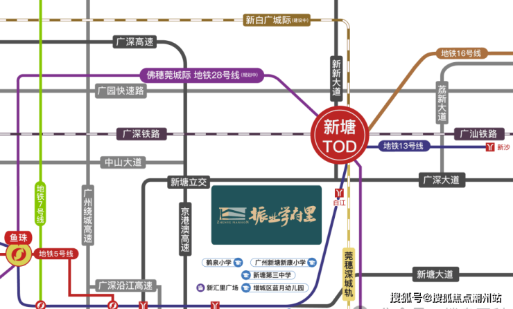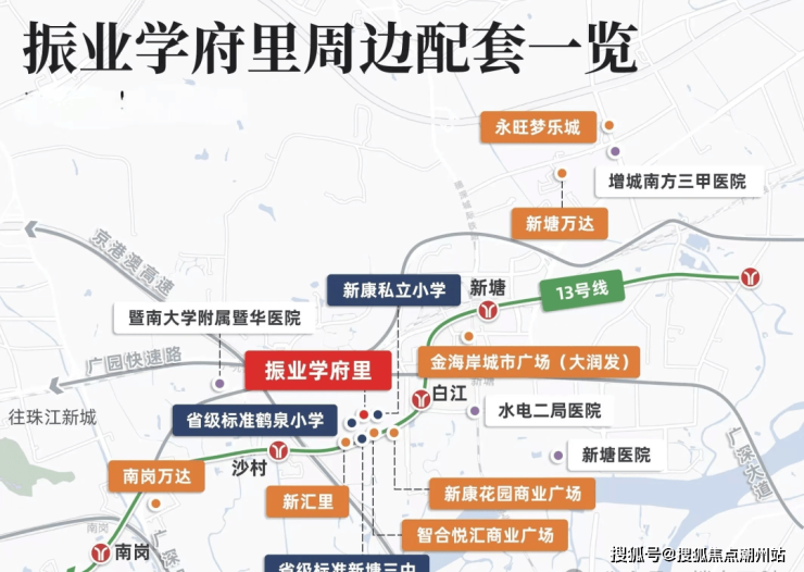 位于广州市增城区新塘石场路1号,广州地铁13号线沙村站和白江站双地铁口之间;坐落于广州东进战略首站、新塘东江新城桥头堡城芯,是新塘最近广州市区的位置,三大千亿级产业集群,紧邻新塘TOD枢纽,坐拥片区少有醇熟城市发展圈。