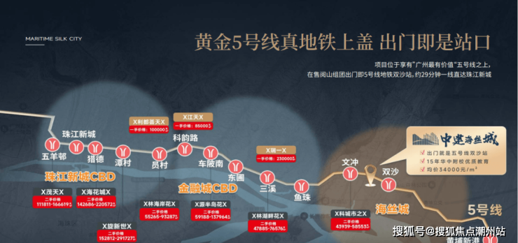 海丝城从入市以来,还是颇有争议的,但是地铁5号线地铁口的优越位置加上学校的官宣,让这个网红盘新货入市炸场了。没错就是老黄埔的中建海丝城二期:悦辰花园即将入市,产品做的非常炸裂,据说即将推出的是二期的5栋和6栋使用率高达150%。老规矩,先看详细位置。