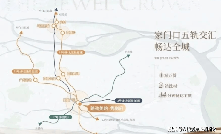交通配套项目距离最近的地铁站3号线番禺广场站约800-900米左右,在这里有4条地铁交汇,分别为18-22-3号线,还有规划中的17号线,去珠江新城、琶洲都是直达过去