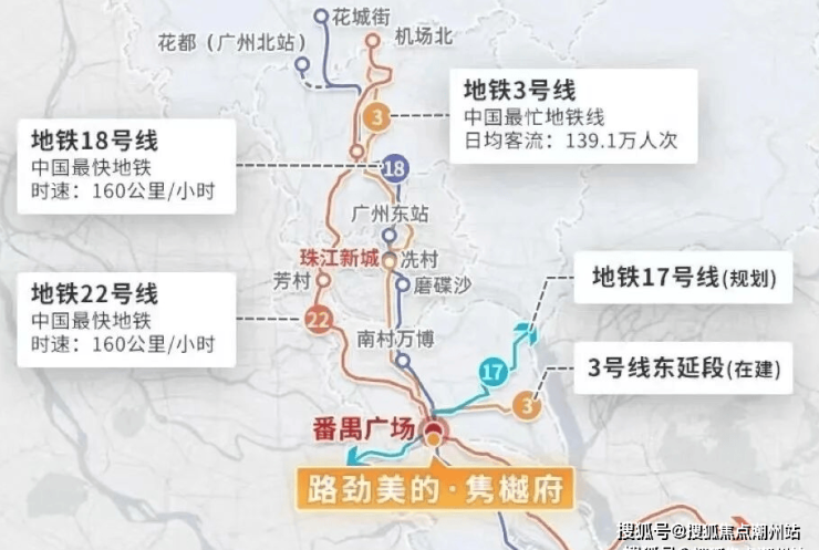 项目距离最近的地铁站3号线番禺广场站约800-900米左右,在这里有4条地铁交汇,分别为18-22-3号线,还有规划中的17号线,去珠江新城、琶洲都是直达过去