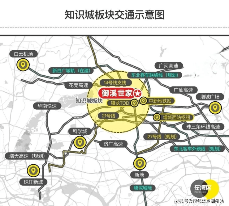 交通配套, 这个楼盘属于在两个地铁站中间,距离地铁21号线中新站(约1000米)、地铁14/21号线镇龙站(约900米),在这个楼盘坐地铁的话,建议直接去镇龙站,可以选择坐快线,3站到天河。到镇龙站也可以坐新白广一大城轨,可接驳穗莞深城际,北至白云机场,南达深圳宝安机场,西连广州东站,通达佛山西站,速达大湾区各核心城市。同时还有业主楼巴车可以接驳到地铁口