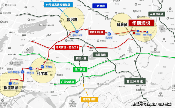 华润润悦项目地处21号线山田地铁站与钟岗地铁站中间,距离都2公里左右,走路基本要半个小时,很明显的不现实,最好的骑个电动车接驳,家门口3000㎡润悦花园公交首末站,接驳地铁,坐地铁一个站到增城广场站换快线,5个站就可以到天河。