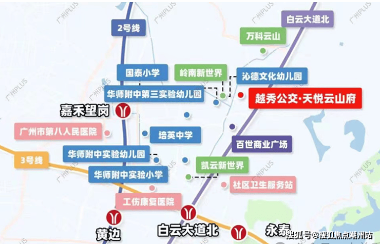 越秀公交·天悦云山府虽然不近地铁,距离14号线东平站步行距离1.7km,距离2/3号线嘉禾望岗站、白云大道北站步行距离约2km;无车一族需要公交接驳,但项目楼下就是公交TOD站点,可以通过公交无缝接驳2/3/14号线、18号线(在建)。下楼坐电梯直达公交站场,换乘地铁也就三四个站。