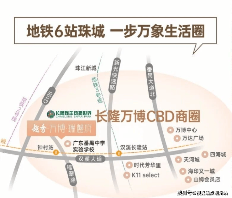 自驾的话,家门口钟顺路连接汉溪大道、南大干线(已开通),双动脉横贯番禺核心,约10分钟长隆万博CBD,约30分钟珠江新城。