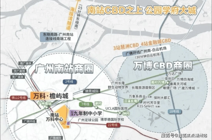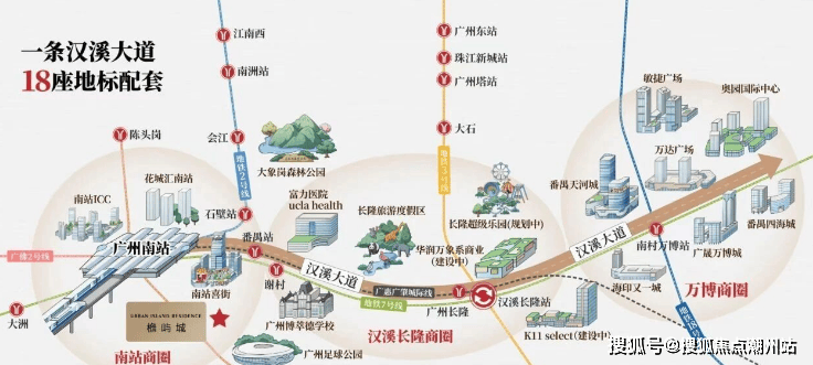 广州南站串联万博、长隆两大板块,以“超级枢纽+超级商圈”模式平移都市中心,南站8km范围聚集番禺70%的经济总量、70%的常住人口,拥有前沿的产业体系+集中的商业配套+宜居的生态资源+高效的通勤速度,是番禺最适合生活居住的组团,打造广州不可复制的“黄金动脉”。