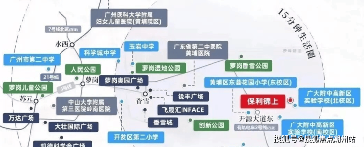 项目商业配套:小区配建约1500㎡商业街,大奥园广场等。项目直线900米还规划了一个大型商业综合体。周边有区府香雪商业配套,萝岗万达、保利未来香雪城(在建)等约300万方醇熟商业。