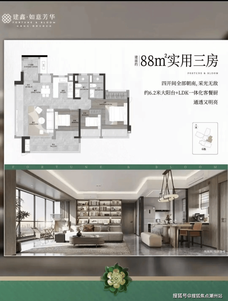 户型设计是建鑫鹅潭名郡的核心亮点。 项目推出 88㎡三房两卫、105㎡三房两卫、125㎡四房两卫三种户型,均采用新规设计,空间利用率显著高于同类产品。所有户型均为全南向布局,采光通风条件优越,且配备入户花园和超大飘窗,增加实用空间的同时提升居住舒适度。 88㎡三房两卫是区域*的中小户型,三开间朝南,阳台开间约 6.2 米,可灵活隔出一间卧室,满足多孩家庭需求。