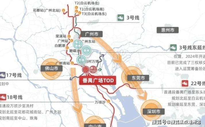 广州保利琅誉坐落于番禺广场TOD的核心区域,傍雁路附近,距离正在建设中的地铁3号线东延段滂江站直线距离不到600米,步行大约1公里,目前施工进度已达90%,预计明年通车。这意味着在您收楼之前即可享受到便捷的轨道交通服务。从滂江站出发,不仅可以直达珠江新城,还能一站抵达番禺广场换乘18号线和22号线,大大缩短了前往广州主城区的时间成本。