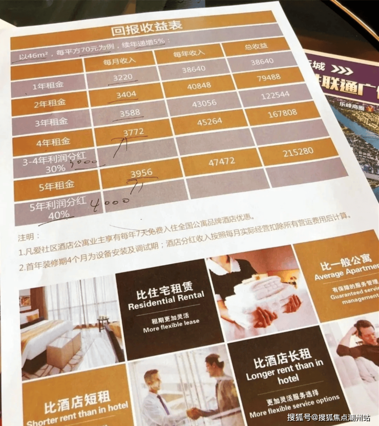目前富凯星堤已和广州爱社区酒店管理有限公司合作,可选择与该公司签订返租协议,现按照70元/㎡/月计算,每年递增5%,租期可自由选择2-5年;另外,第3年至第4年,酒店管理公司还将返还30%的利润分红(利润为扣除保底租金、人工成本后的收益);第5年,则返还40%的利润分红,届时收益均可在爱社区的app上查询。
