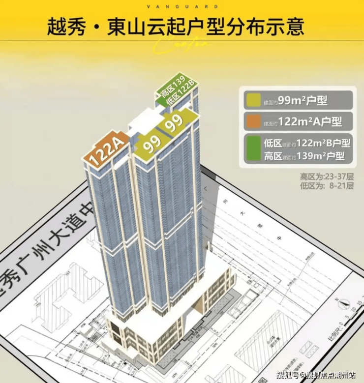 越秀东山云起项目总高37层,其中1-6层为配套设施,7层和22层为架空层,从8楼开始才是可售的住宅单位,项目周边基本都是楼龄比较旧的二手,所以这116套新规住宅注定会很抢手。