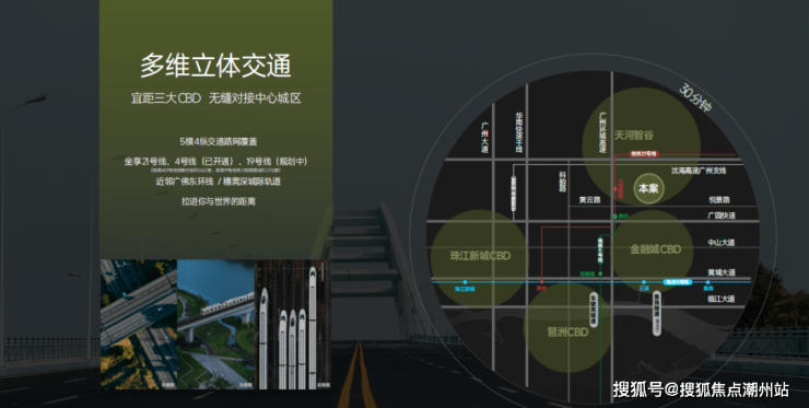 交通配套地铁:周边直线 3km 范围内有 4 个地铁站,分别为大观南路、黄村、神舟路、天河智慧城,距离最近的地铁站是大观南路,约 1.2公里。道路:拥有 5 横 4 纵交通网,悦景路已经拓宽至尾声即将通车,奥体北路延长线已通车,可实现 20 分钟通达三大 CBD,驾车出行较为便捷。